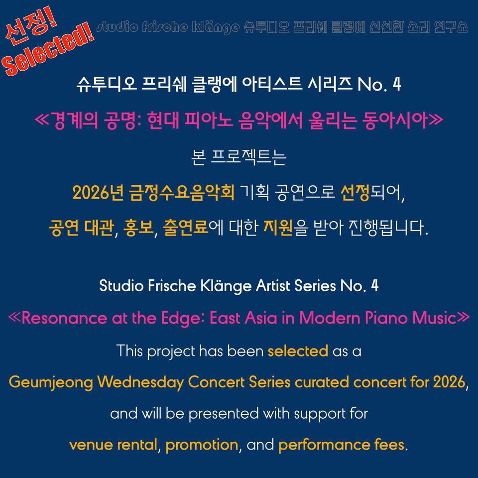 2026년도 금정수요음악회 공모에 슈투디오 프리쉐 클랭에(이하 SfK) 아티스트 시리즈 No.4 «경계의 공명: 현대 피아노 음악에서 울리는 동아시아»가 선정되었습니다.